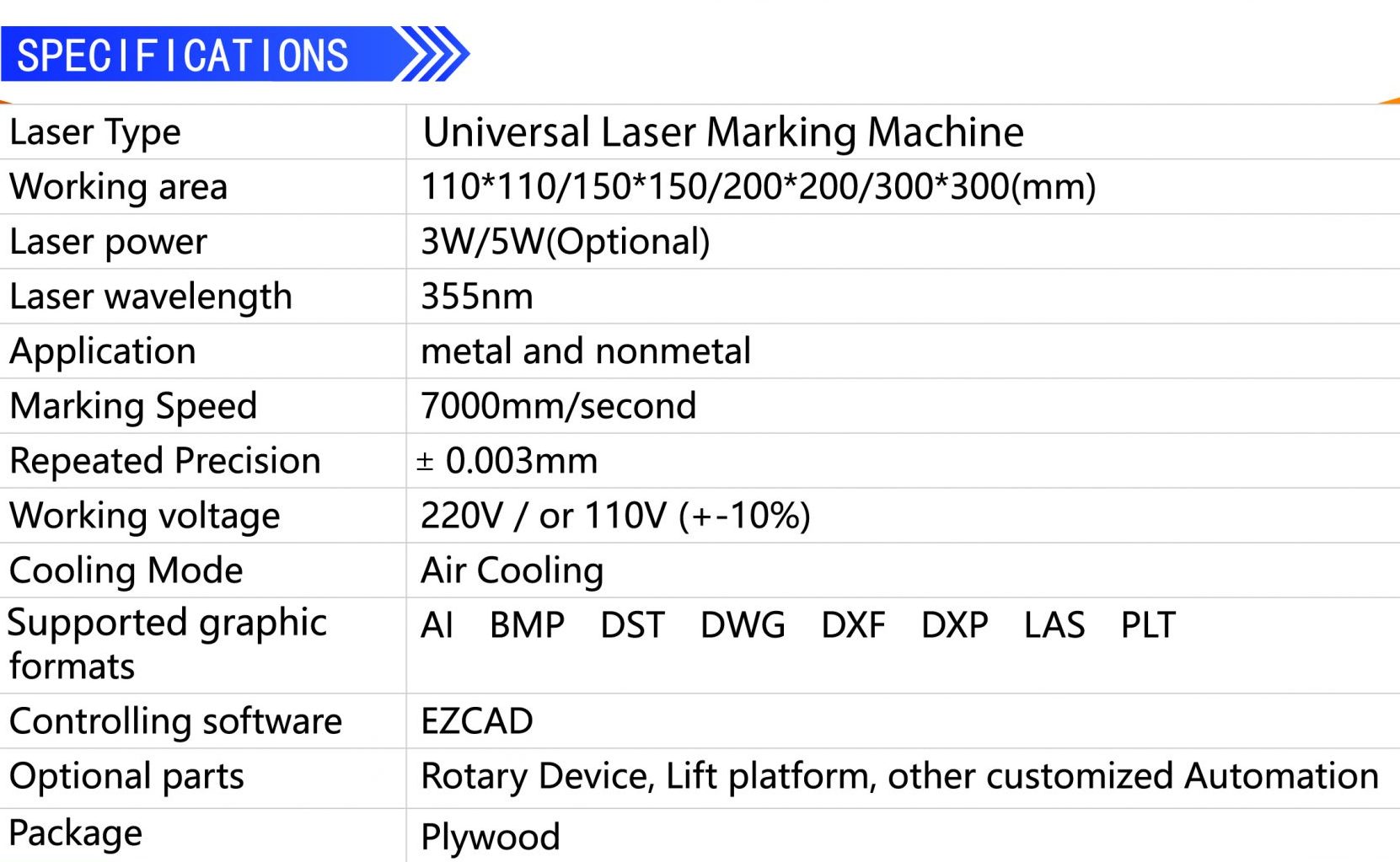 - Laser Power 3w/ 5w (Optional): Kekuatan laser diberikan sebagai pilihan: 3W atau 5W. Ini menunjukkan kekuatan dari sinar laser. Kekuatan laser yang lebih tinggi umumnya mampu menandai berbagai material dan mencapai tanda yang lebih dalam.